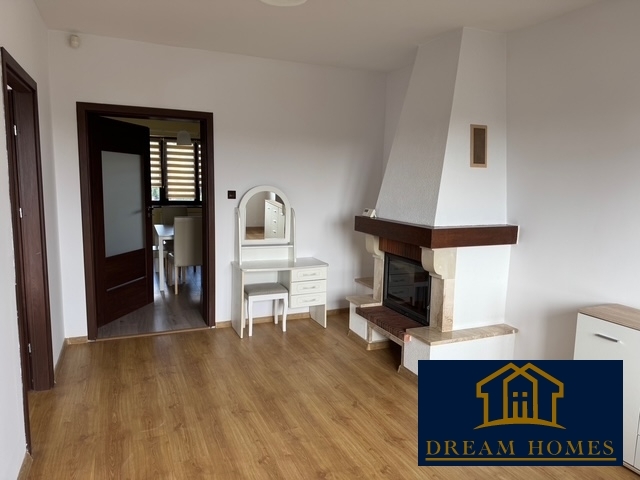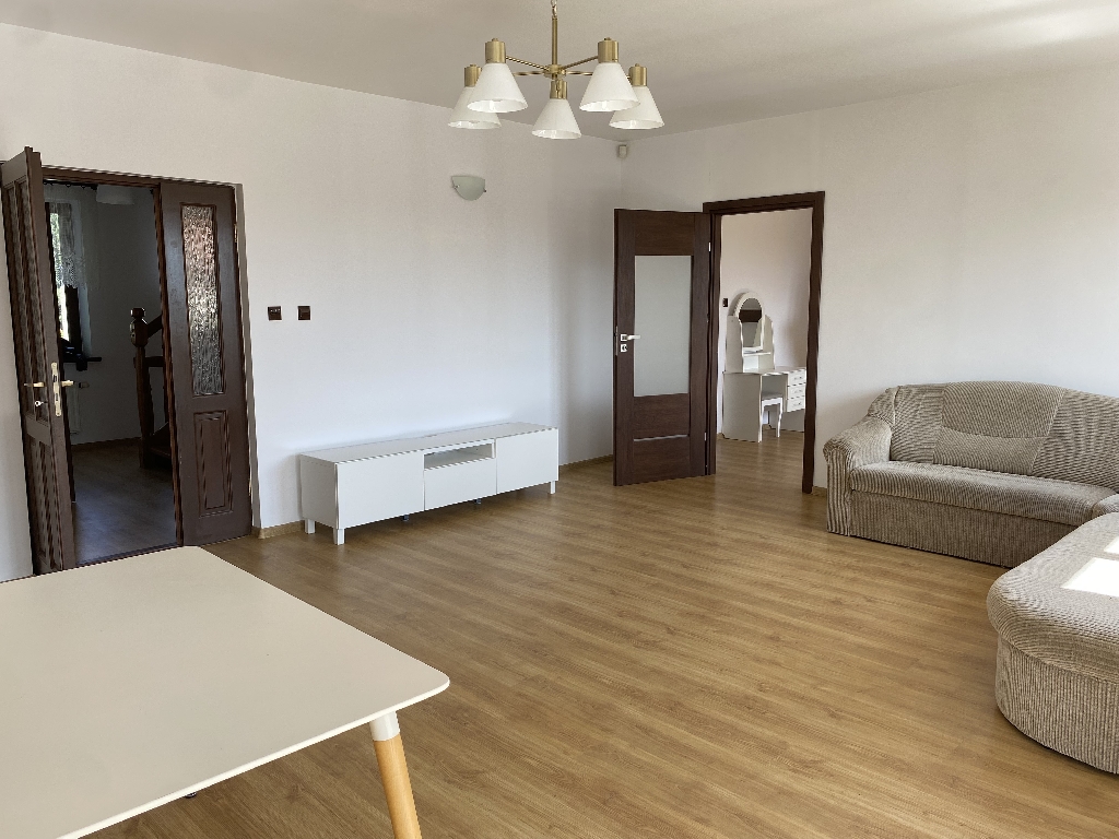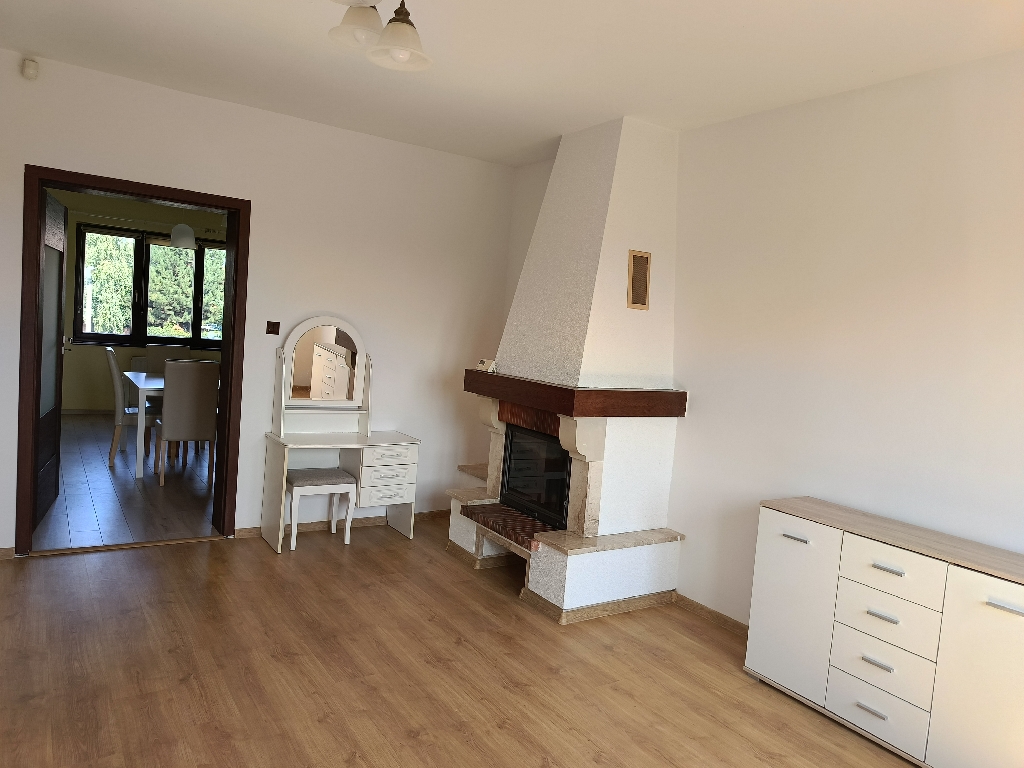 Na pierwszym piętrze jest duży salon 29 m2 z wygodnym tarasem skierowanym na południe i z pięknym widokiem . pokój z kominkiem 14 m2 oraz kuchnia z jadalnią 16,40m2 i łazienka z WC i prysznicem .